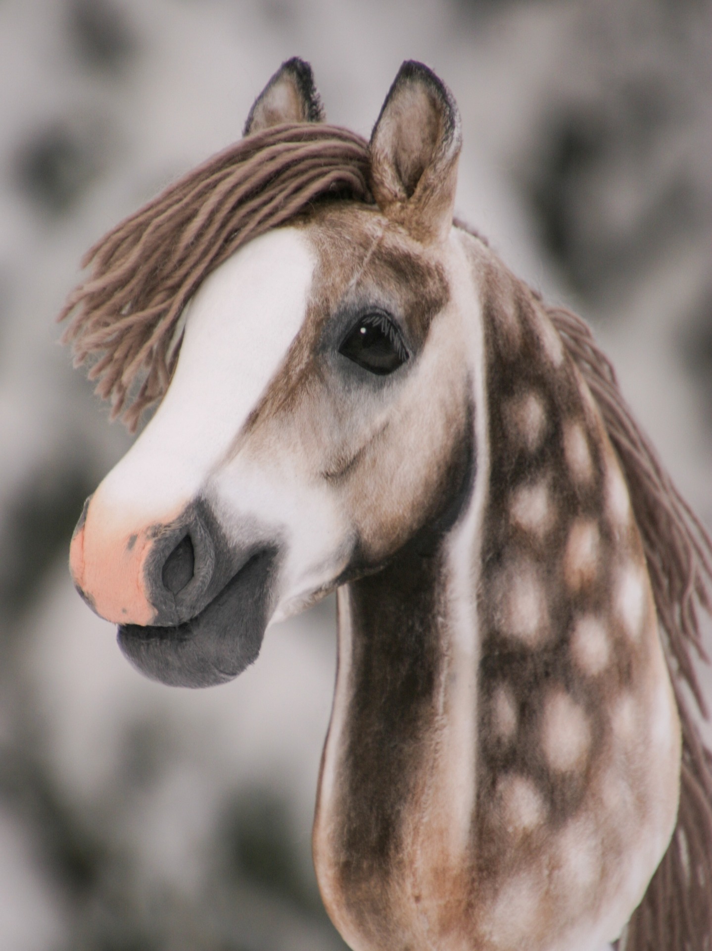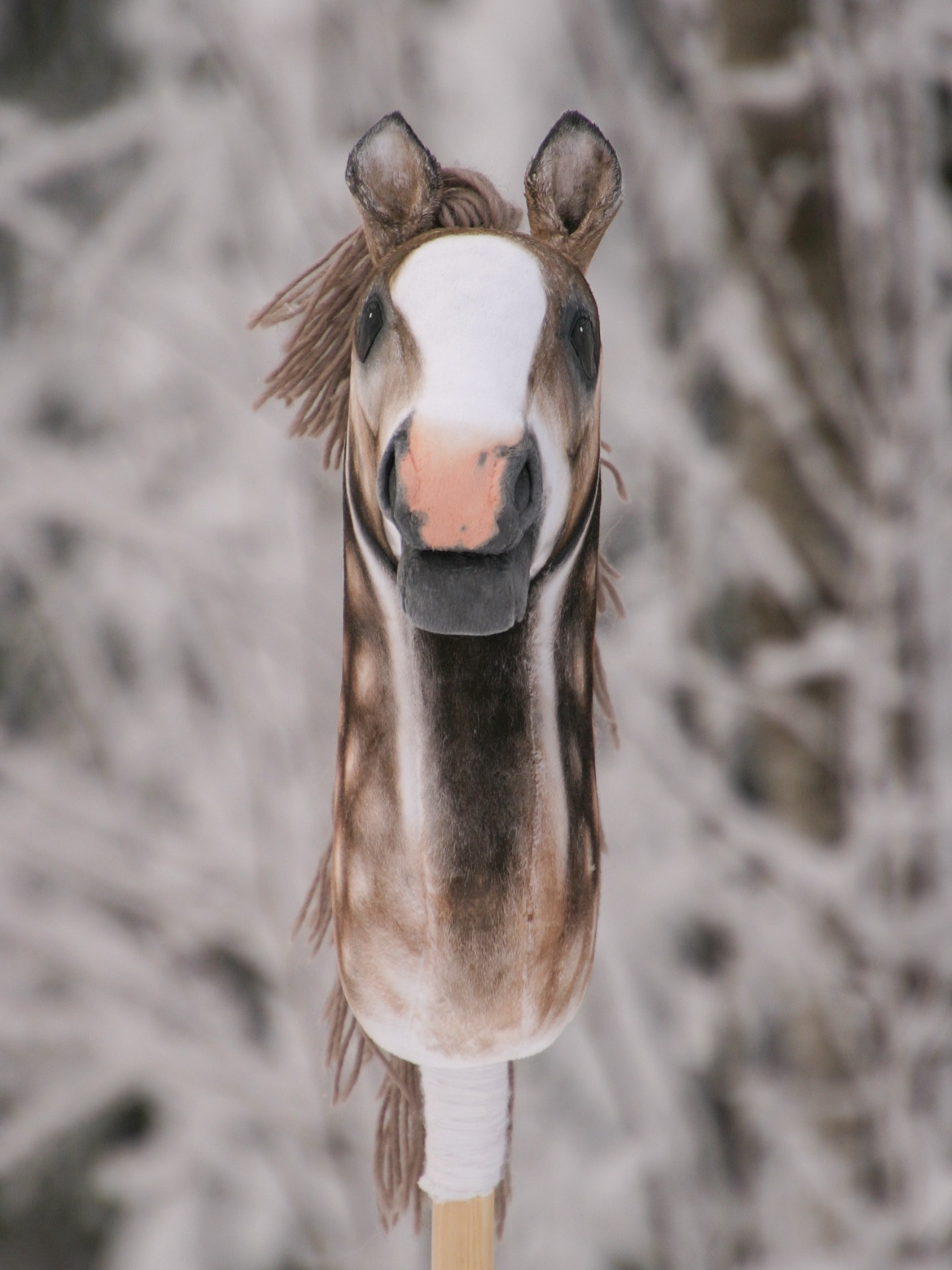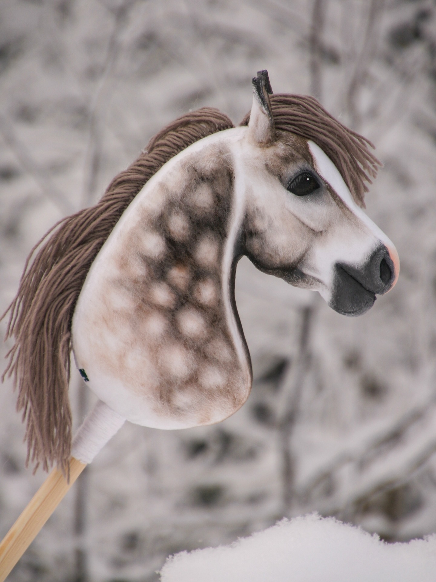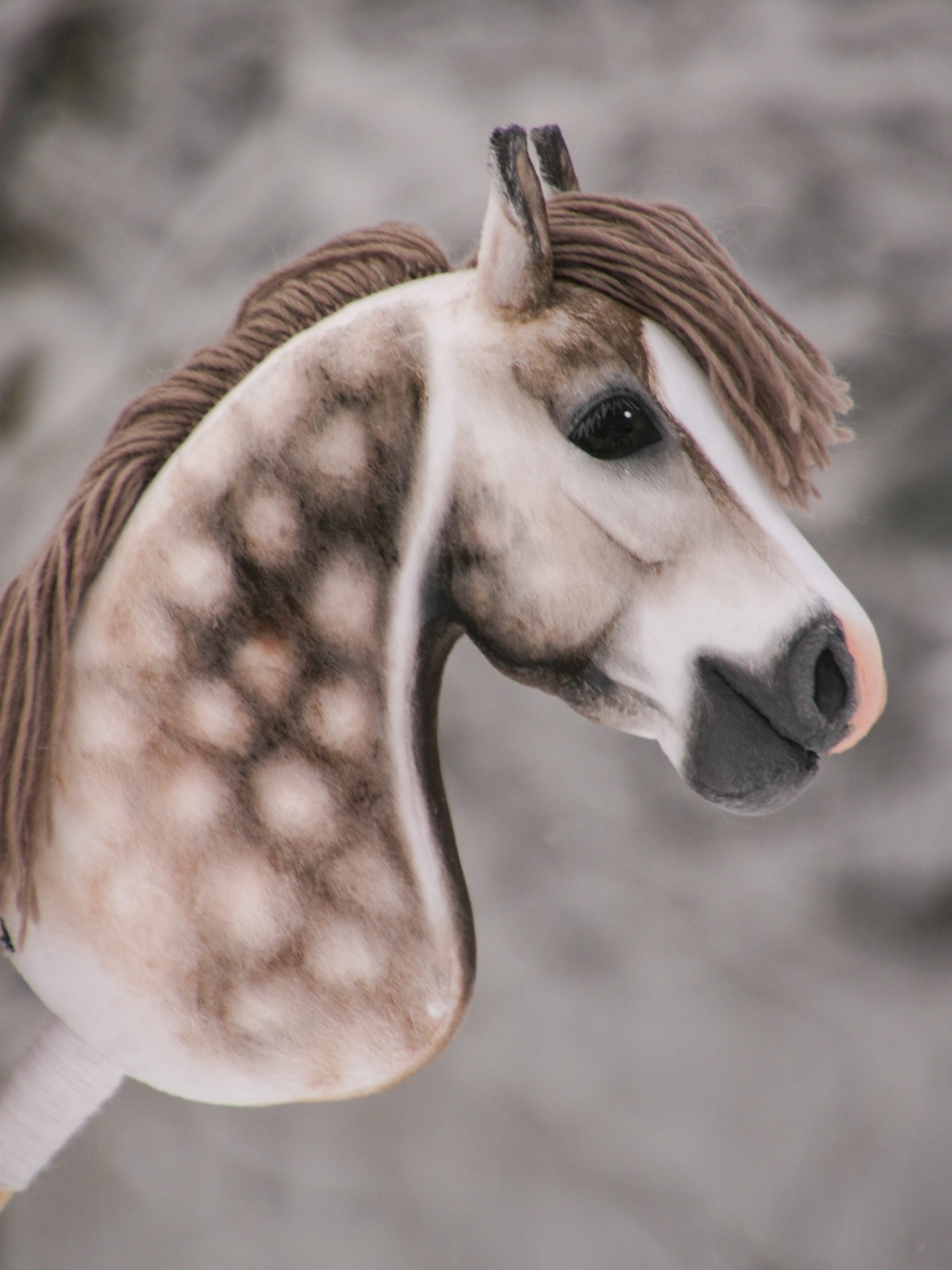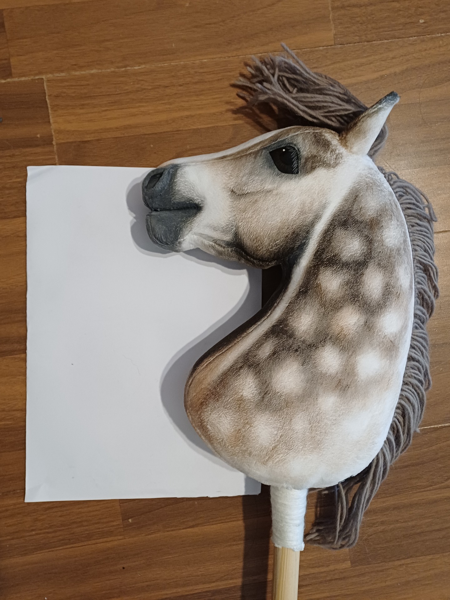 An M-sized, rose gray arabian hobbyhorse. Stick is included.